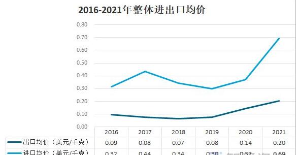 我國石英及石英巖全體進口均價繼續領先,2021年進口均價為0.69美元/千克,出口均價僅為0.2美元/千克。