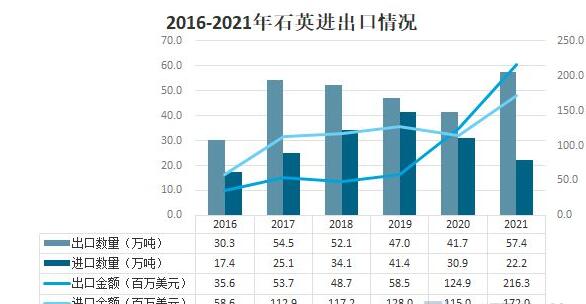 我國石英出口量較大,進出口量差距逐步拉大。2021年,我國出口石英57.4萬噸,較2020年增加38%,出口金額為216.3百萬美元,我國進口石英22.2萬噸,同比下降28%,進口金額為172百萬美元。